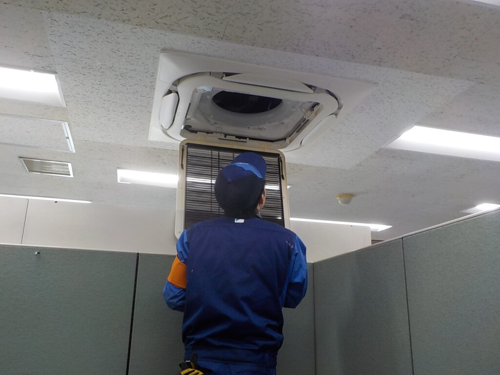 ビルの室内機の定期点検を行っています。年数が経過すると部品の一部が消耗してくるので、管理させていただいているビル会社様には定期点検にて部品の交換を施しております。故障してしまう前に原因を未然に防ぐことができるので、常日頃快適な空間で過ごせることができます。それは私たちの願いでもあり、お客様にとっても喜んでいただいているので誠心誠意、点検・交換を行わさせていただいています。
